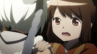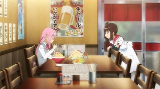 看板娘として、チームメイトだろうと初対面の魔法少女だろうと鶴乃は”万々歳営業”を欠かせません。こちらもTVアニメ版第4話でいろはに料理を振舞った時のシーンですが、いろはがご飯を食べ進めている最中鶴乃は目の前でずっといろはを食べている所を凝視し、味は何点かといろはに執拗に聞きます。普通にお店でそんなことされたらちょっと怖いですよね。